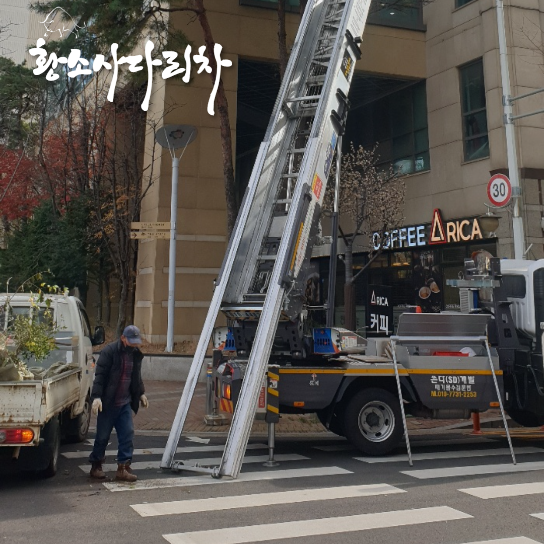 현장에 도착하자마자 바로 사다리차를 대기시킬 수 있도록 주변을 확인하고 사다리차를 세워두었습니다.간판을 철거하기 위해서 얼마나 사다리를 꺼내야 하는지 확인 후, 사다리차를 작동 시켜 작업을 진행해야 하는 곳에 고정했습니다.