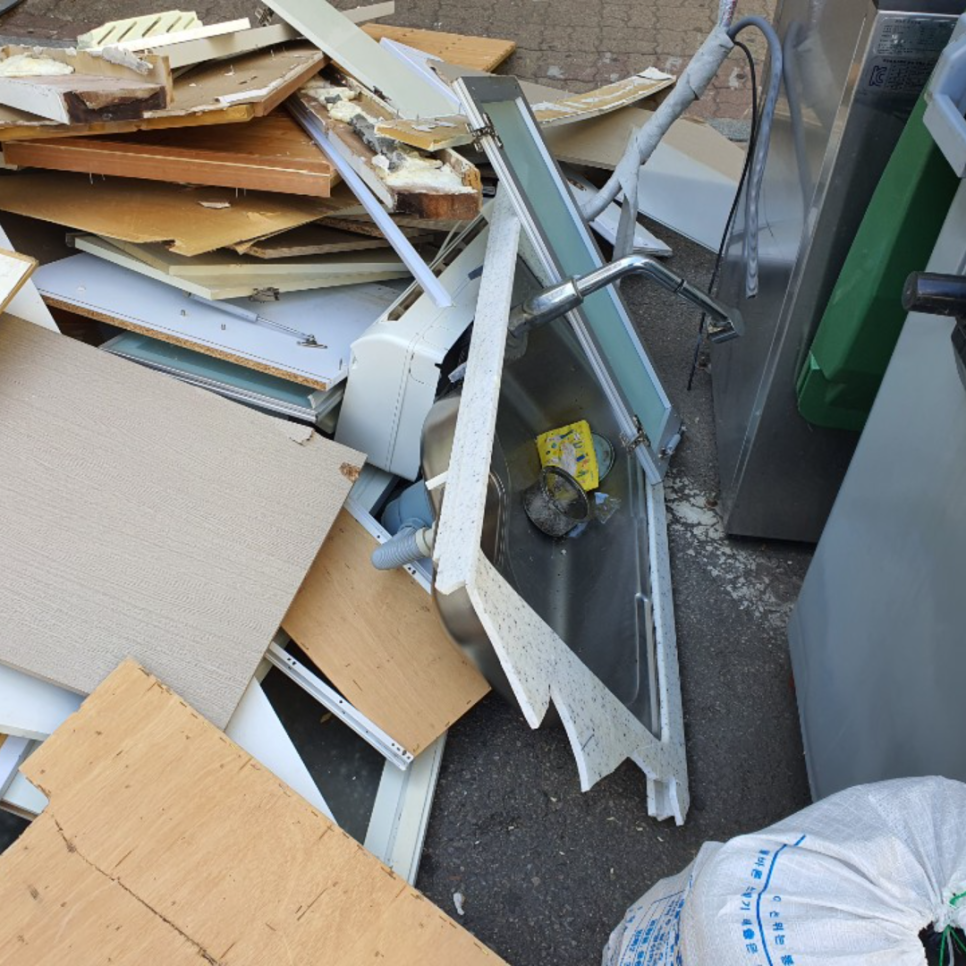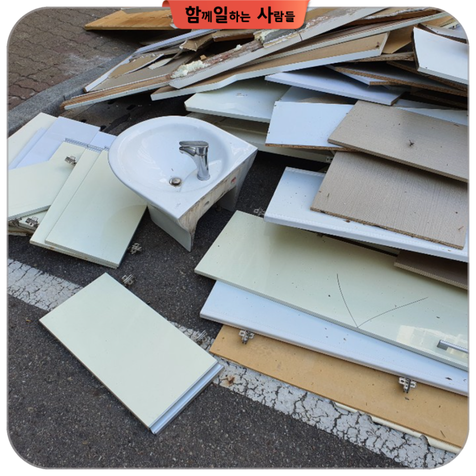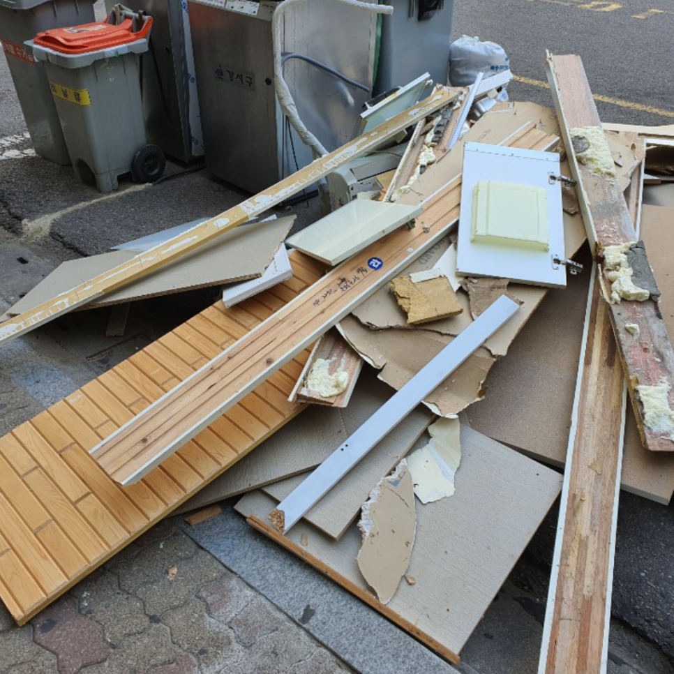현장에 도착하니 분리해둔 목재 판들과 세면대와 같이 부피가 큰 폐기물이 널브러져