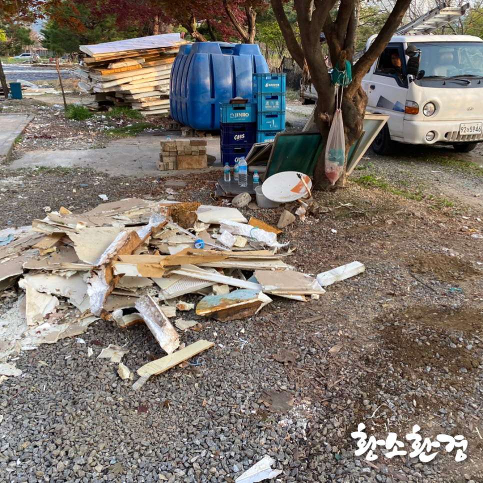 바닥에 널브러져 있는 잔해들도 말끔하게 정리해 트럭에 실어주니 모든 폐기물 처리가 끝이 났습니다.