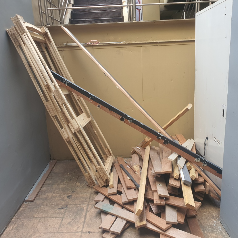현장에 도착하니 목제들과 같이 다른 것들이 섞여 벽 쪽에 세워져 있는 모습이 보이네요.
