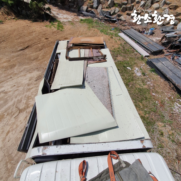 전부 실어준 것을 확인하고 가장 위에 얇은 폐기물을 올려주고 마무리를 위해