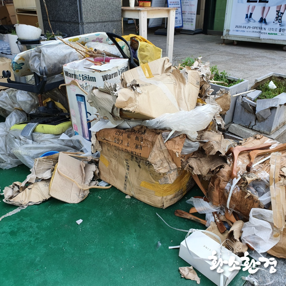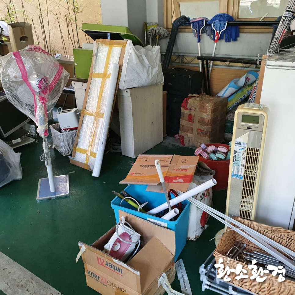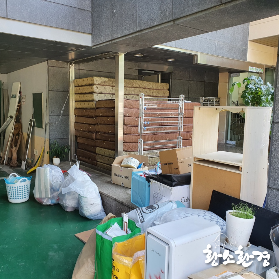 정리하시면서 선풍기, 매트, 가구들과 상자 등 다양한 폐기물이 산더미처럼