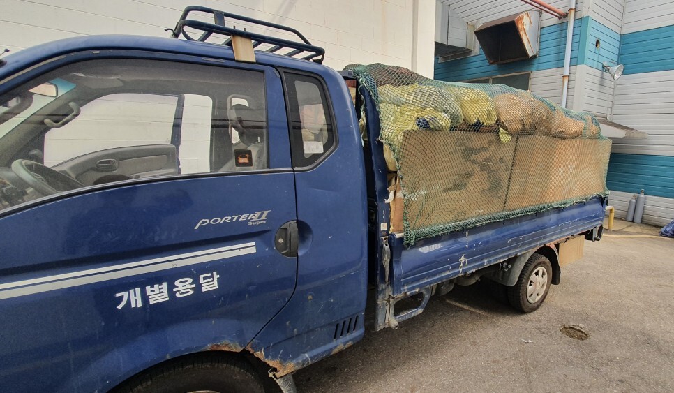2.5톤 트럭의 폐기물 처리 상차 후 모습인데요, 안전 등의 문제로 실제 운반하는데, 적정한 높이입니다.