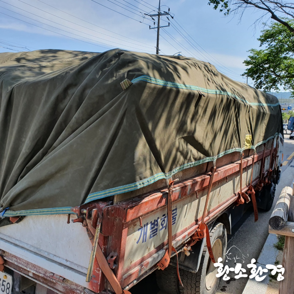이제 폐기물을 옮기면서 트럭에서 흔들리거나 하지 않도록 천으로 덮어