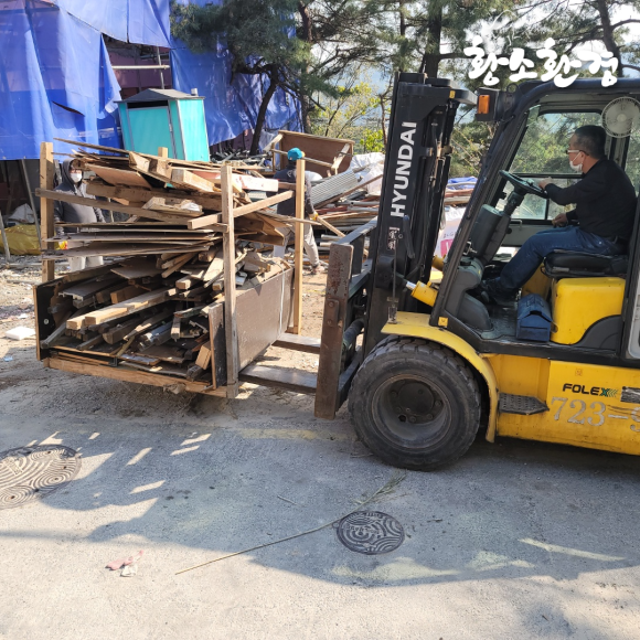 폐목 같은 경우에는 양이 많아 중장비를 이용하여 한 번에 들어 올려