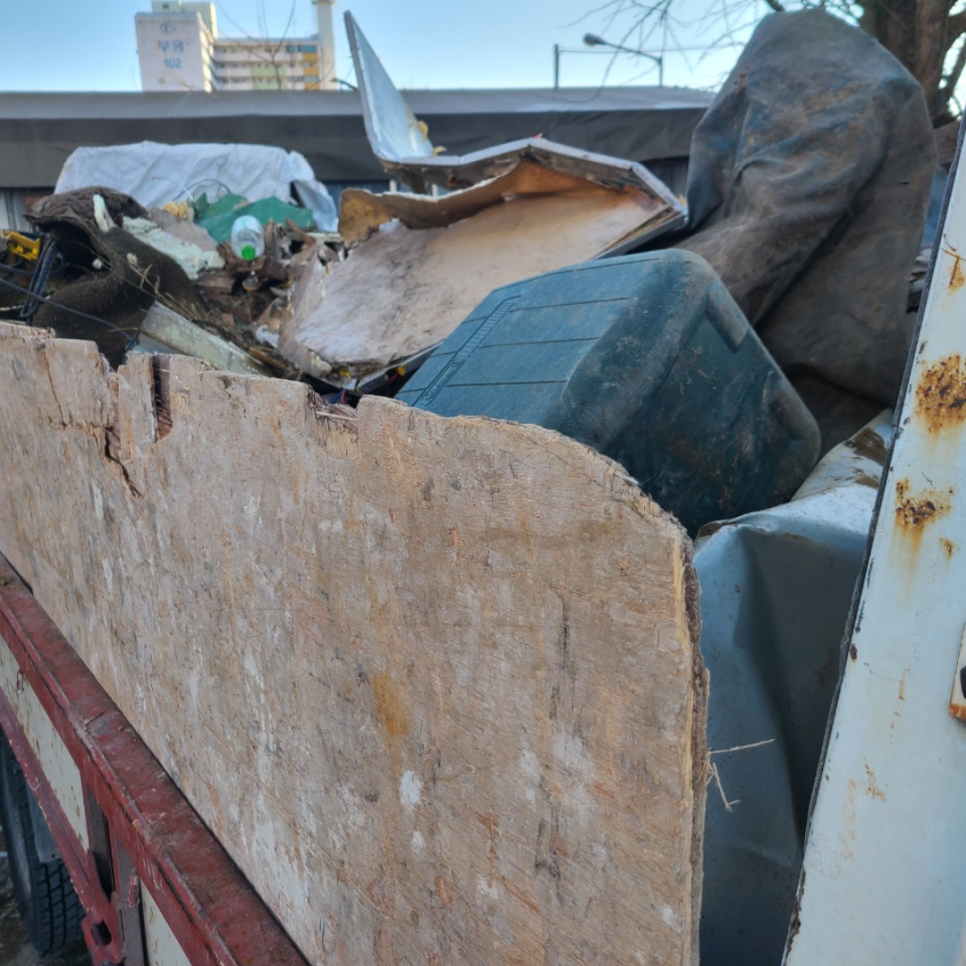 모든 폐기물을 트럭으로 옮긴 것을 확인하고 천으로 트럭을 덮어