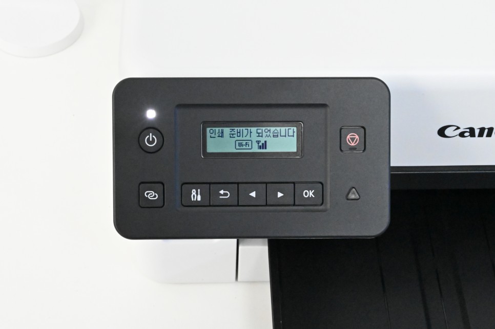 잉크를 넣고 나서 바로 설정을 했는데, 언어 설정과 와이파이 설정을 PC와 연결하지 않고 바로 컨트롤 패널에서 진행했습니다. 유선 케이블이 제공되지만, 저는 대부분 무선 네트워크를 이용해서 프린트를 합니다.