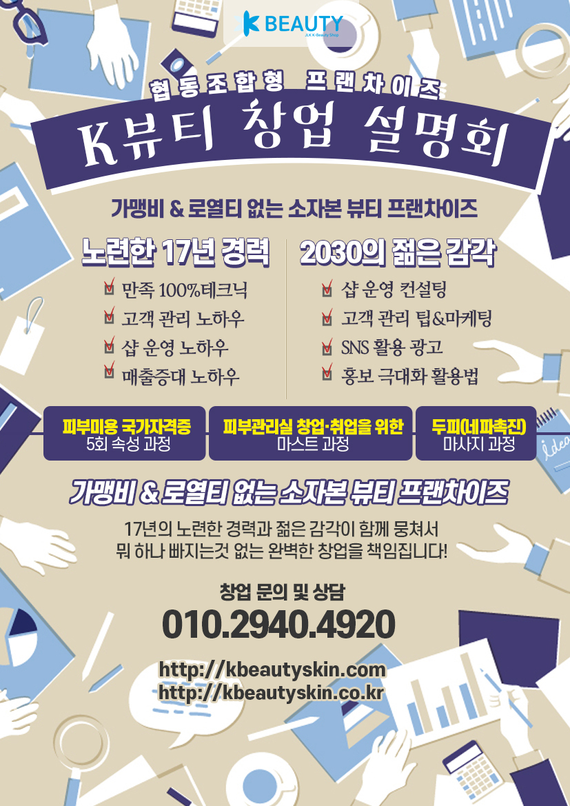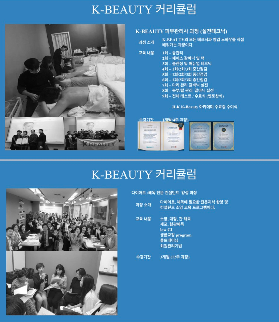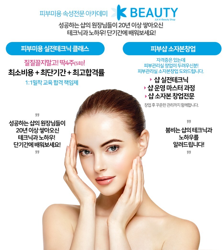 피부자격증속성으로 준비하시고 창업 실전테크닉을 피부샵에서 마스터하시고 실제 손님을 대상으로 인턴과정을 연수하시면서 샵운영 마케팅이나 손님대상 상담기법을 공부하시게 되고 이과정도 JLK K-Beauty에서 창업하시는 분들에게 제공됩니다