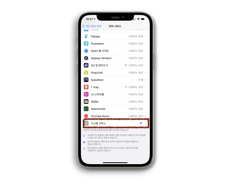 제일 하단에는 시스템 서비스 메뉴가 있습니다. 그리고 위치 서비스의 화살표에 대한 설명이 나오고 있습니다.