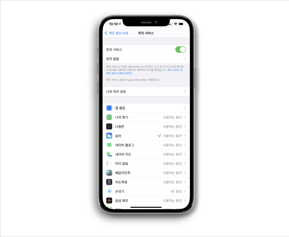 위치서비스에 들어가면 위치 서비스를 활용하는 앱들이 보입니다. 나의 찾기(나의 아이폰 찾기)앱이나 지도 등은 필수로 위치 서비스를 설정해야 합니다.