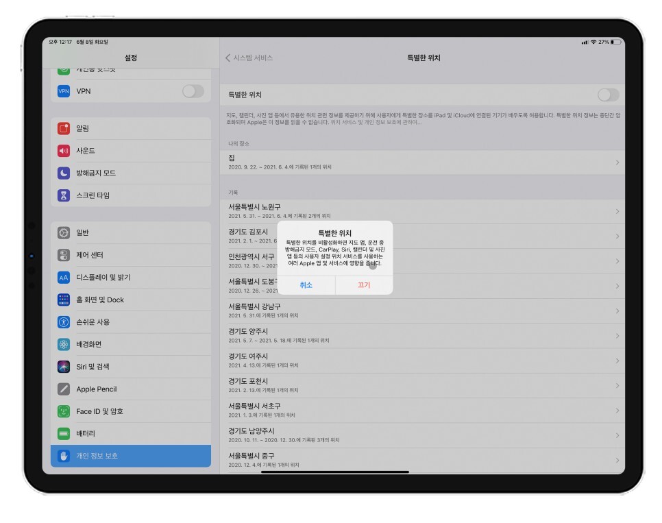 셀룰러 모델인 아이패드 프로에도 특별한 위치로 위치가 노출이 되는 군요.. 작업을 하면 설정이 켜지기 때문에 아이폰 보다는 위치의 기록이 별로 없습니다.