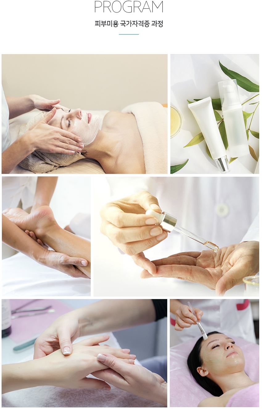 자격증 소개 국산업인력 관리공단에서 시행하는 피부미용사 국가기술자격증 취득을 준비하는 과정으로 자격 검정 기준에 준하는 필기와 실기과제에 대한 교육을 실시합니다. 교육내용 차트 / 클렌징/ 눈썹 정리/ 메뉴얼 테크닉/ 딥클렌징 / 팩 / 마스크팩 / 팔 관리 / 다리 관리 /제모 / 림프 관리 수강기간 주 과정 (주 2회-월/목요일, 8강)