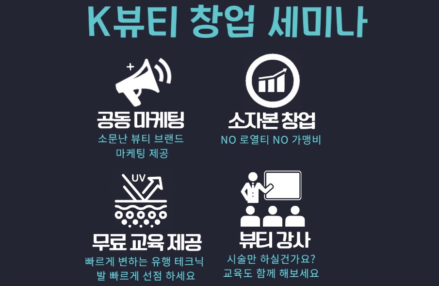 단순히 교육으로 피부미용자격증 취득을 뿐만 아니라 창업지원 프로그램을 함께 운영하고 있는데, 공동 마케팅은 물론 NO 로열티 NO 가맹비로 소자본 창업을 지원하며, 빠르게 변하는 유행 테크닉에 대한 무료 교육 제공하고 있습니다.