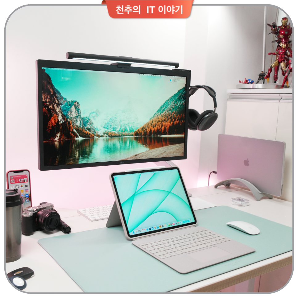 현재 작업을 하고 있는 책상의 배치입니다. 아직 유니버설 컨트롤이 없기 때문에 맥북과 아이패드의 동시작업을 할 수 없어서 조금 복잡합니다. 하지만 유니버설 컨트롤이 적용되면, 마우스, 트랙패드 각 하나씩과 키보드를 없애고 사용할 수 있습니다.