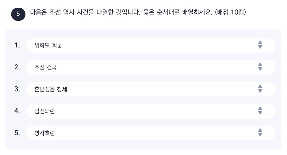정답은 위화도 회군, 조선 건국, 훈민정음 창제, 임진왜란, 병자호란입니다.