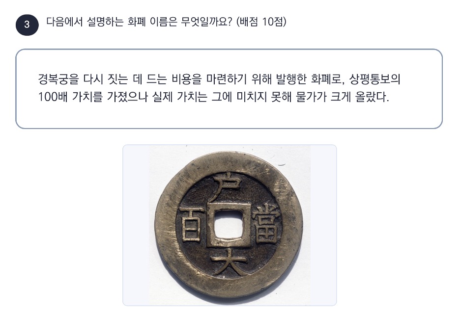 사진의 화폐는 당백전입니다. ‘호대당백’이라고 한자로 쓰여 있는데요. 상평통보의 100배의 가치를 가진다고 하였지만 실제 가치는 그에 훨씬 미치지 못해 조선 경제에 혼란만 주었다고 해요. 가진 돈이 없음을 뜻하는 ‘땡전 한 푼 없다’라는 관용어는 당백전이 어원이라는 이야기가 있어요. (매우 저급한 돈인)당백전 한 닢도 없을 만큼 가난하다는 뜻이었다고 해요.