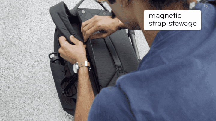 트래블 백팩 45L의 백패널에는 자석이 들어있어 어깨 스트랩 수납 후 자석으로 한 번 더 고정이 가능합니다. 30L에는 자석이 들어있지 않습니다.