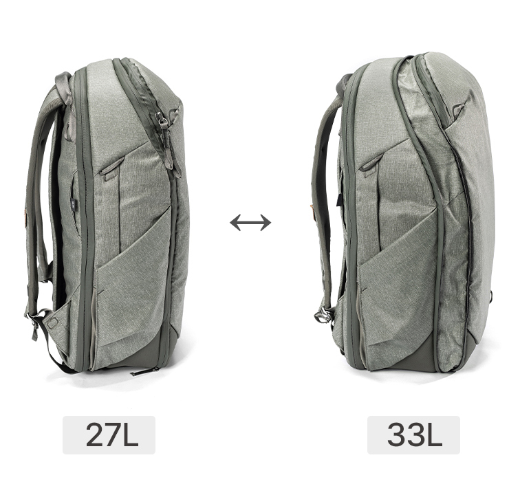 30L의 경우 기본 상태 27L에서 33L로 확장할 수 있으며, 일상생활, 짐이 적을 때는 압축 모드 혹은 기본 모드로 사용하고, 짐이 많을 때는 확장해서 더 많은 짐을 넣을 수 있어요.