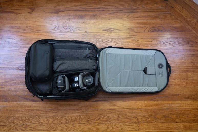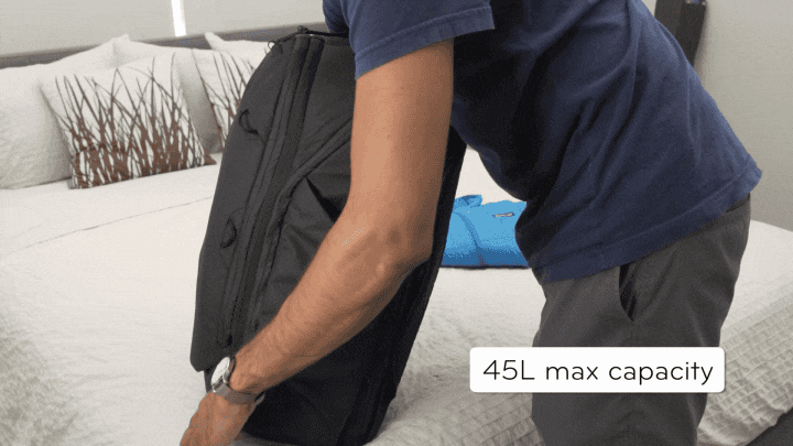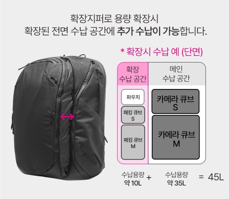 특히 용량을 45L로 확장하면 전면 공간의 폭이 넓어지면서 부피가 있는 패킹 큐브, 테크 파우치 등을 수납할 수 있습니다.