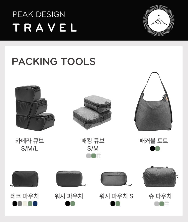 장비를 수납할 땐 카메라 큐브, 옷가지 수납엔 패킹 큐브, 다양한 테크 제품과 액세서리 수납은 테크 파우치, 칫솔과 화장품의 수납엔 워시 파우치, 여벌의 신발은 슈 파우치를 이용하여 수납할 수 있습니다. 패커블 토트는 작게 접어 수납했다가 필요할 때 펼쳐서 추가적인 보조 가방으로 활용할 수 있습니다.