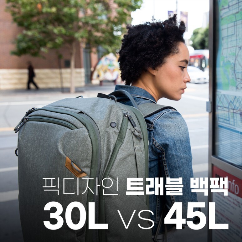 픽디자인 트래블 백팩은 30L, 45L 두 가지 용량으로 출시되었는데요. 많은 부분에서 동일한 성능을 가지고 있긴 하지만, 용량 뿐 아니라 소소하게 다른 차이점도 가지고 있는 백팩입니다.