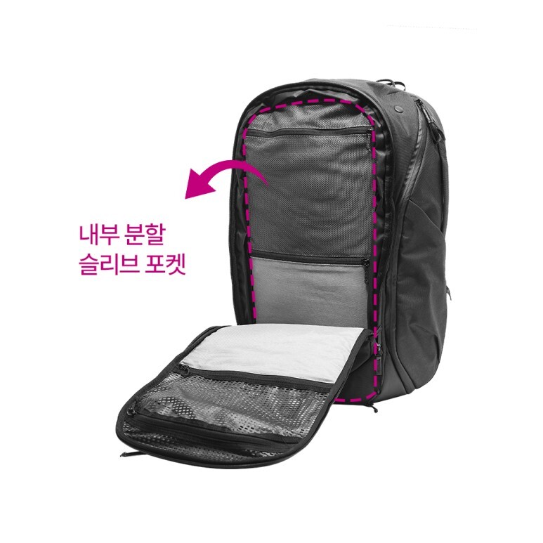 트래블 백팩 30L는 내부 분할 슬리브 포켓이 없어 메인 수납 공간을 분할하여 사용할 수 없습니다.