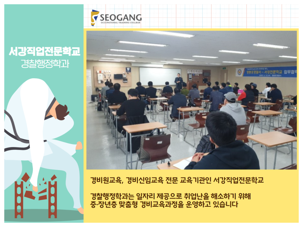 아울러, 서강 직업전문학교는 경비원 교육, 경비 신임교육 전문 교육기관입니다. 경찰행정학과는 일자리 제공으로 취업난을 해소하기 위해 중·장년층 맞춤형 경비교육 과정을 운영중입니다.