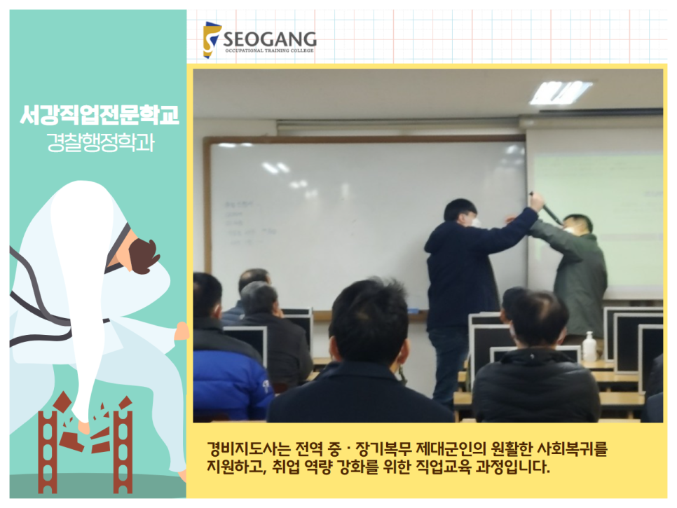 서강 직업전문학교 경찰행정학과는 2월 21일에 개강하는 경비지도사과정을 운영하며, 제대군인 및 전역한 경찰 등의 사회 복귀를 지원하고 있습니다.