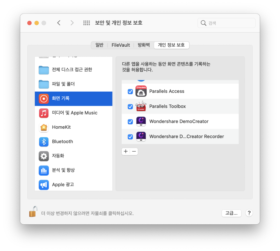 설정 > 보안 및 개인 정보 보호 >> 화면기록에서 노트북화면캡쳐 프로그램인 DemoCreato를 사용을 허용하여야 합니다.
