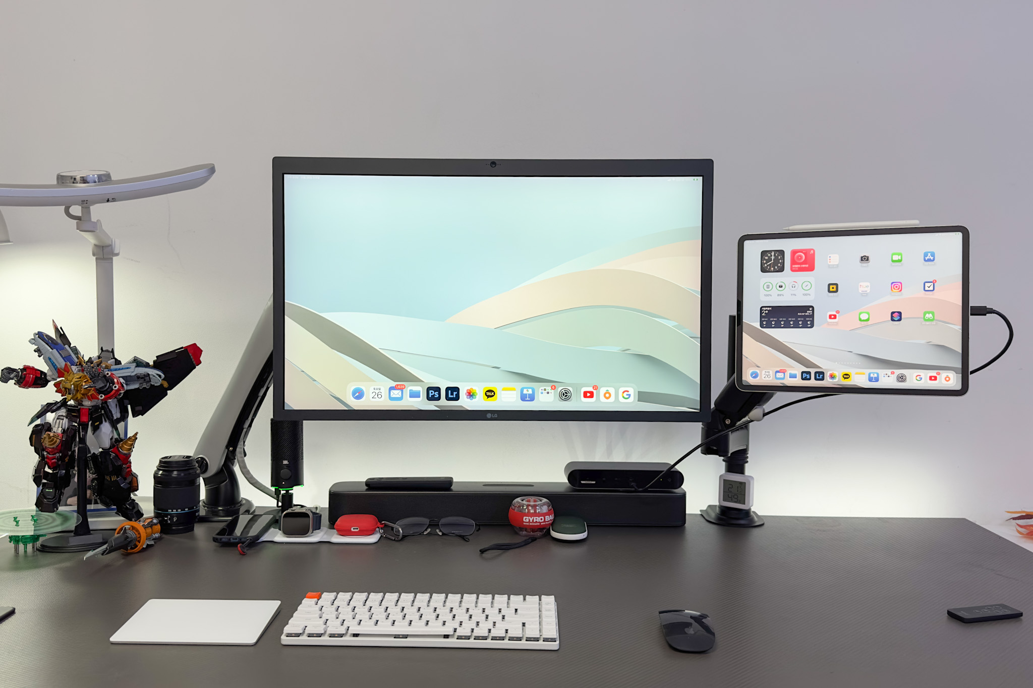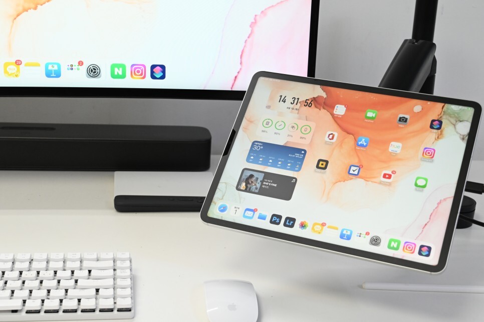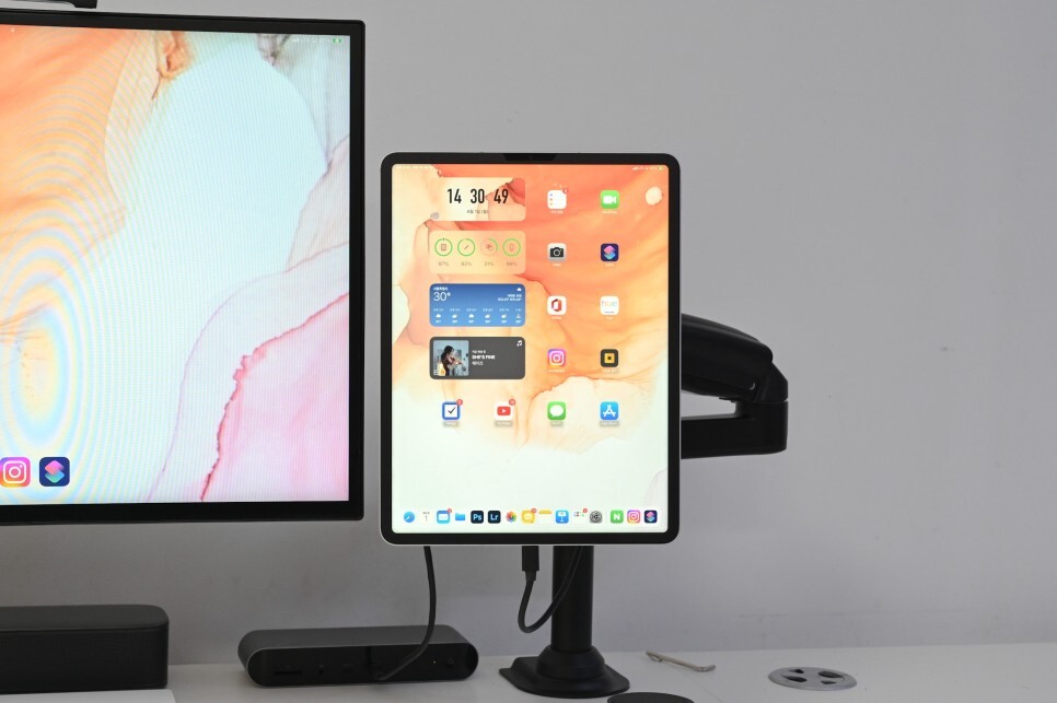 아이패드를 모니터암과 연결해서 가로로 듀얼 모니터로 사용하니 정말 좋은 것 같습니다.