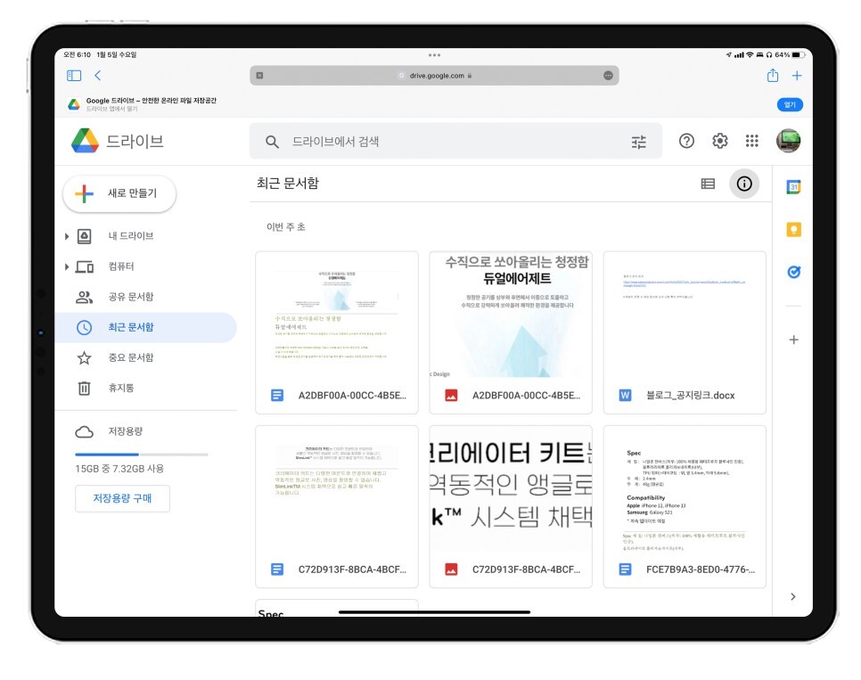 구글 드라이브에 들어가면 "내 드라이브 > 새로 만들기 >파일 업로드" 이미지를 업로드합니다. 아이패드에서는 드라이브 앱이 아니고 사파리 브라우저에서 구글 드라이브에 들어갑니다.