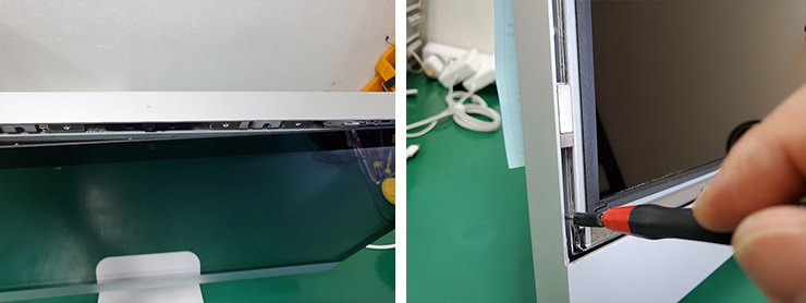 수리과정에 제일 먼저 필요한 부분은 액정패널을 분리하는 과정입니다. 주의해야 할점은 드라이버 모양이 십자나 일자모양이 아니기 때문에 개인이 작업할때는 공구도 잘 확인해야 합니다.