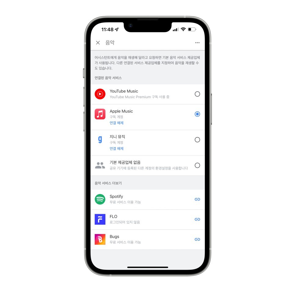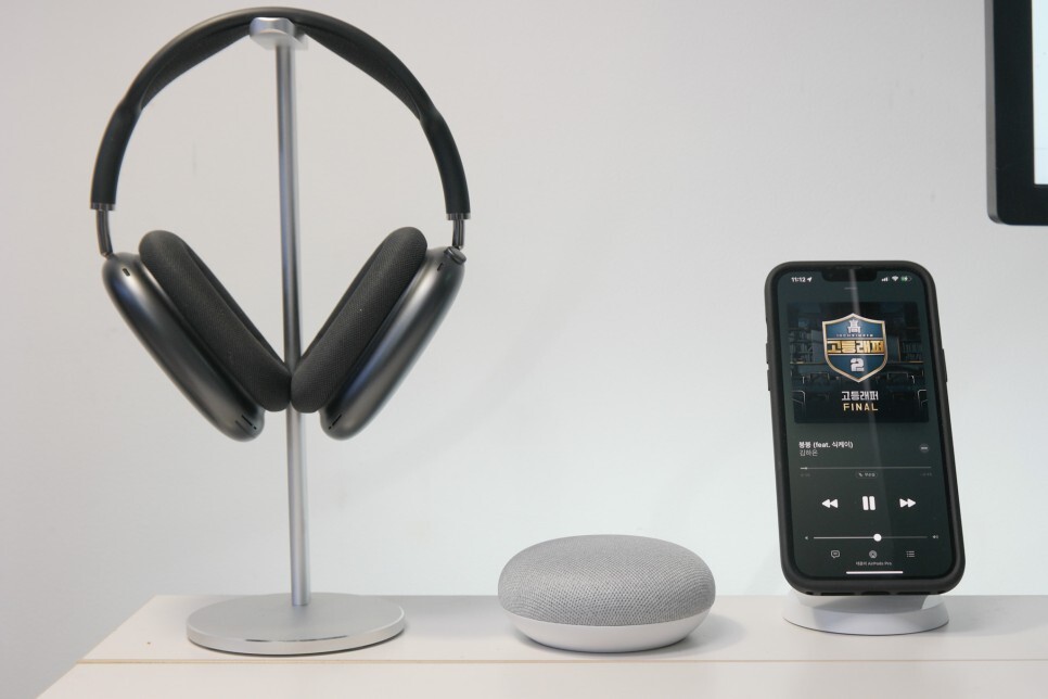 "Hey google 음악틀어줘"로 연동된 애플 뮤직을 들을 수 있습니다.