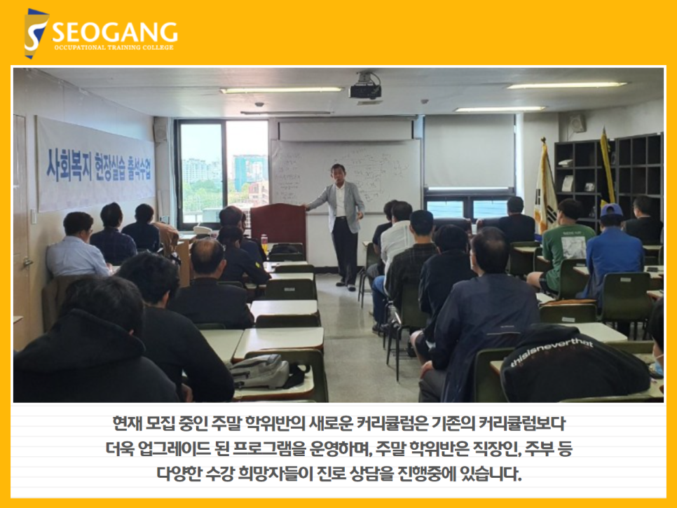 체계적인 현장 지도와 실습일지 작성에 대한 일대일 코칭 수업이 특징인 서강 전문학교의 사회복지 현장실습 과정은 경력개발과 자기계발을 원하는 직장인들을 위하여 주말반을 개설, 운영중입니다.