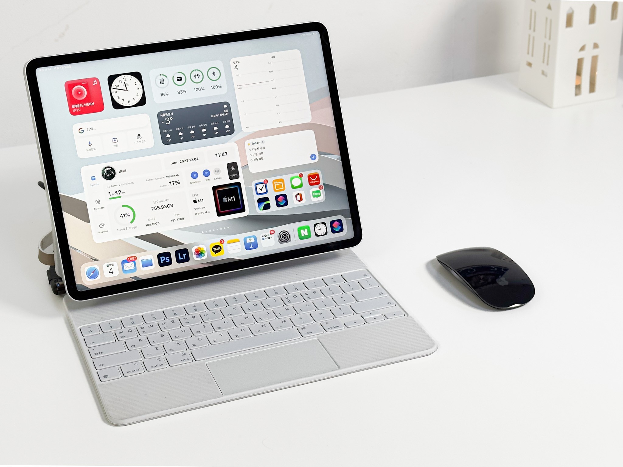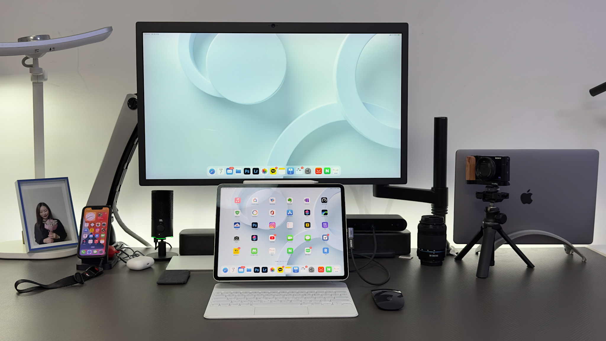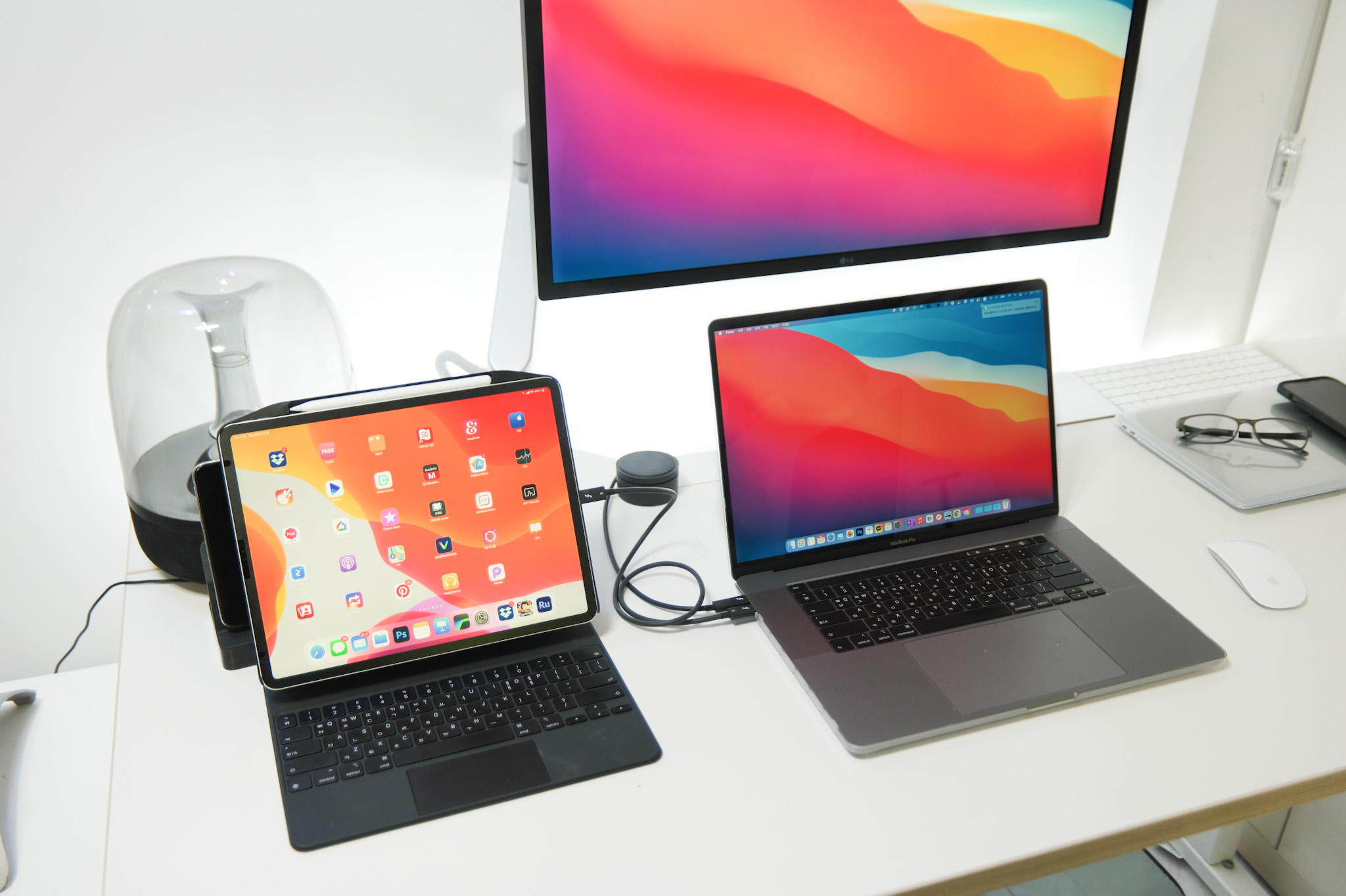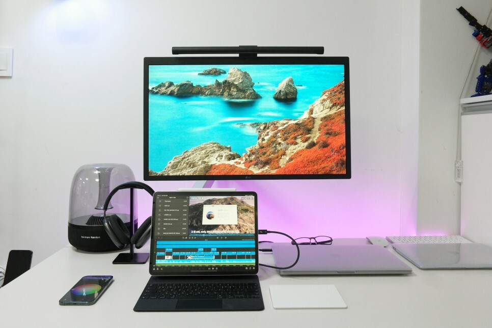맥북프로와 5K 모니터를 Thunderbolt™로 연결하고 아이패드프로는 벨킨 썬더볼트 독을 이용하고 있습니다.