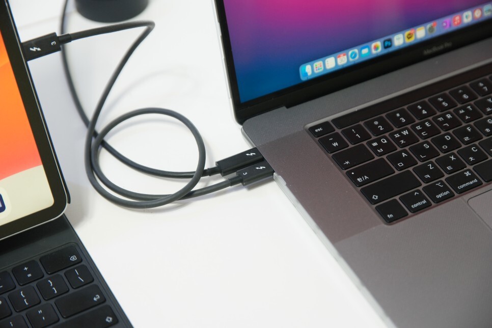 아이패드 프로 5세대 부터 썬더볼트를 지원하고 있습니다. 썬더볼트는 애플 제품에 많이 쓰이지만, 인텔이 개발한 데이터 전송 규격입니다. USB(Universal Serial Bus)와 HDMI(High-Definition Multimedia Interface)를 따로 쓸 필요 없이 데이터와 영상, 음성을 썬더볼트 하나로 전송할 수 있으며, 매우 빠른 전송 속도를 자랑하고 있습니다.