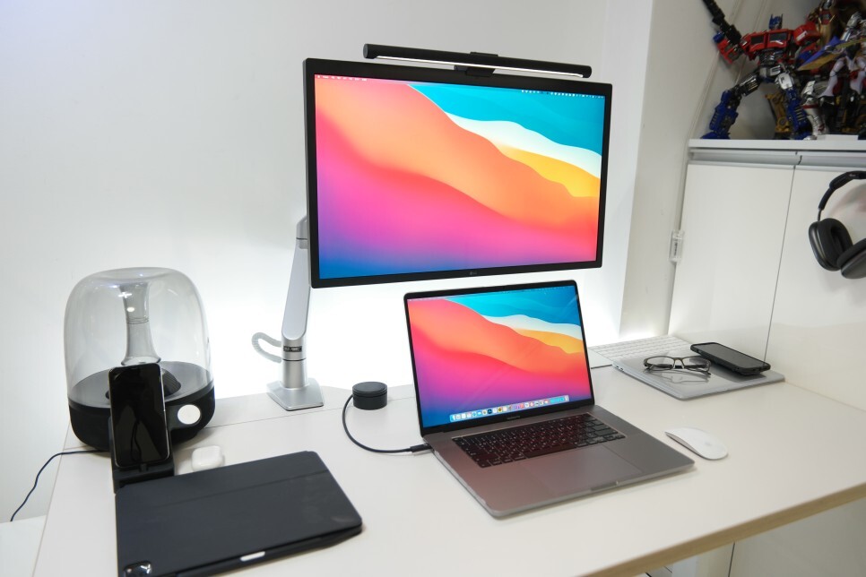 업무를 하는 책상에 5K 모니터가 있는데, 맥북 프로 16인치와 맥북 에어를 , 썬더볼트 단자 하나로 모니터를 연결하면 PD충전으로 추가적인 전원 연결이 필요없어서 하나의 케이블로 매우 깔끔한 책상을 유지할 수 있습니다.