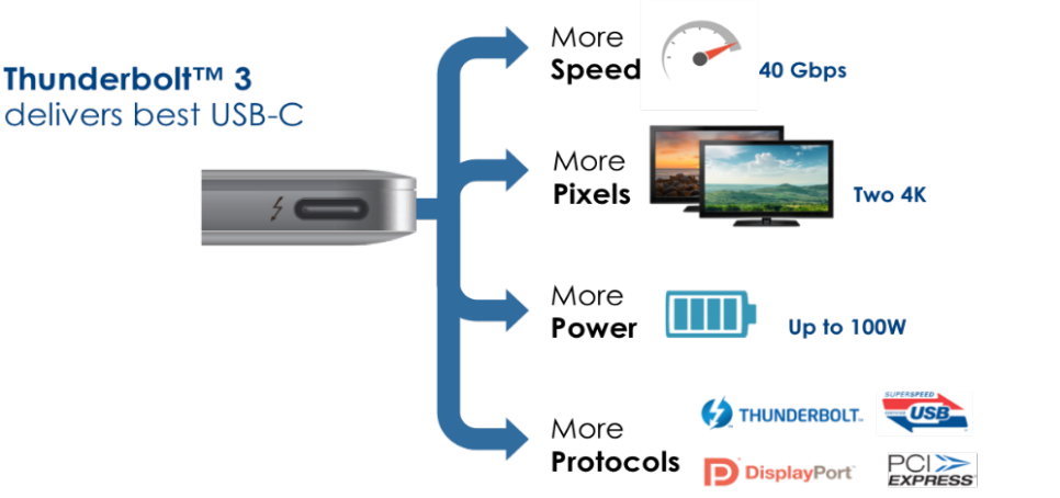 썬더볼트는 PCI 익스프레스(PCIe)와 디스플레이 포트를 하나의 시리얼 통신으로 통합하고, DC 전원도 하나의 케이블로 제공하고 있습니다. 여섯개까지의 주변기기가 버스 네트워크를 통해 하나의 커넥터로 연결될 수 있습니다. 덕분에 썬더볼트 독이라는 제품군이 별도로 있습니다.