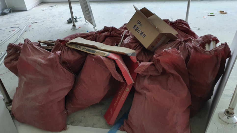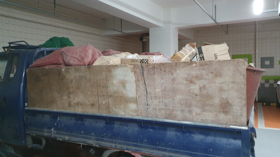 현장을 정리하면서 마대 자루를 실어나르다 보니 점점 깨끗해져 가는 모습이 보이네요. 주변에 정리해두었던 자잘한 폐기물과 상자들을 똑같이 실어 날라주니 어느샌가 트럭이 가득 찬 모습이 보입니다.