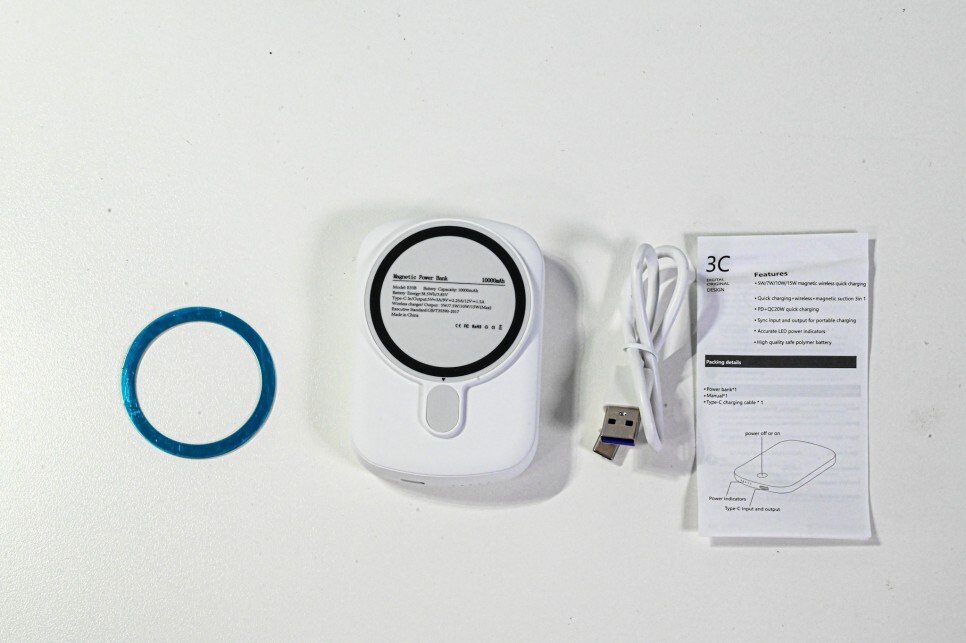 베스트 피플 아이폰용 10000mAh 대용량 맥세이프 보조 배터리의 구성품입니다. 판매처에서는 갤럭시를 지원한다는 의미에서 흡착식이라고 하는데, 마그네틱으로 작동하는 맥세이프 지원제품입니다.