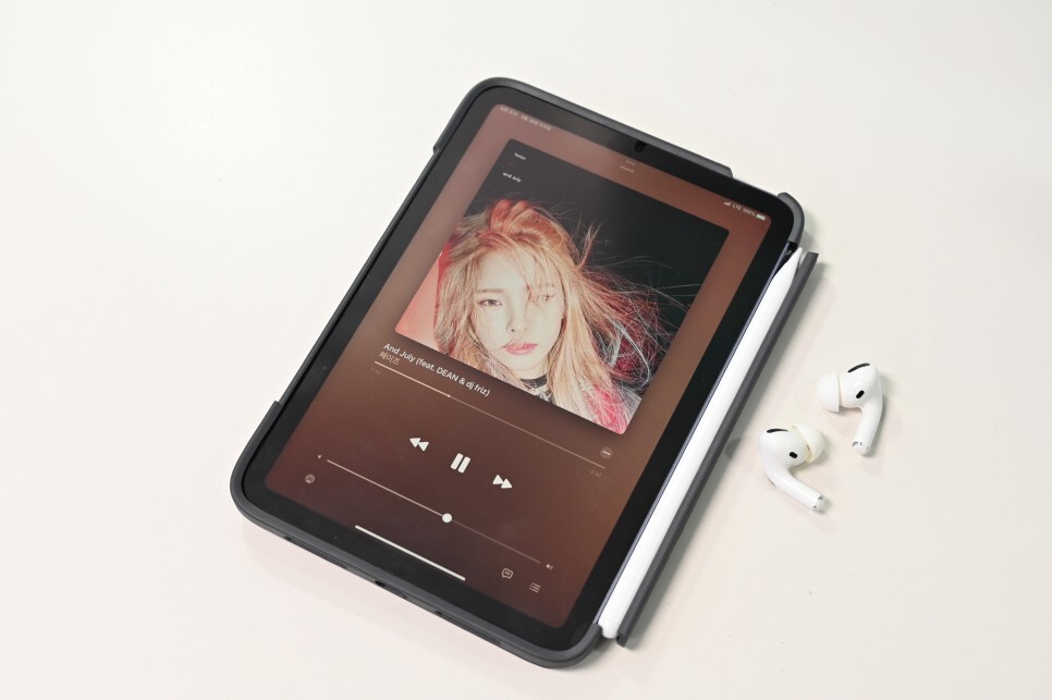가벼운 무게와 다른 아이패드와는 다른 16:10.5의 화면 비율은 레터박스 영역도 적기 때문에 멀티미디어의 활용에 매우 좋은 것 같습니다. 접이식으로 세워서 쓸 수 있기 때문에 활용도가 더 높다고 할 수 있습니다.