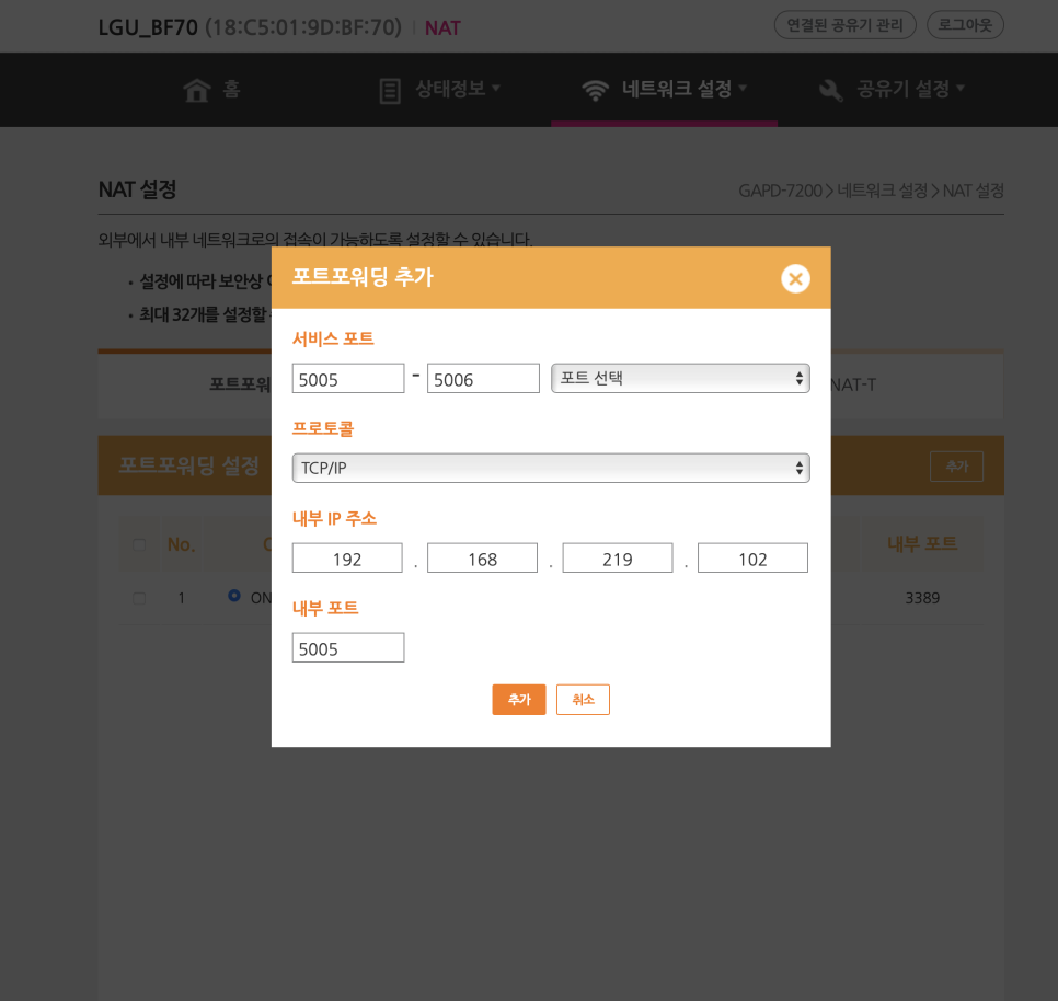 여기서 문제가 생겼다. 라우터를 찾지 못해서 자동 설정은 건너뛰고 수동설정으로 WebDav를 위한 포트를 열어주려고 한다. 포트는 5005를 열어주면 된다. 그래서 공유기 설정으로 넘어가서 포트를 열어주기로 했다.