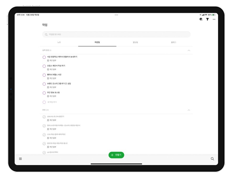 일간 또는 주간 할 일 모음을 업데이트할 수 있는 기능으로 업무 관리를 하기에는 탁월한 기능입니다. 개인적으로 Thins 앱을 이용하는데, 에버노트의 '작업' 기능으로 할일 관리 앱과 같은 기능이 있습니다.