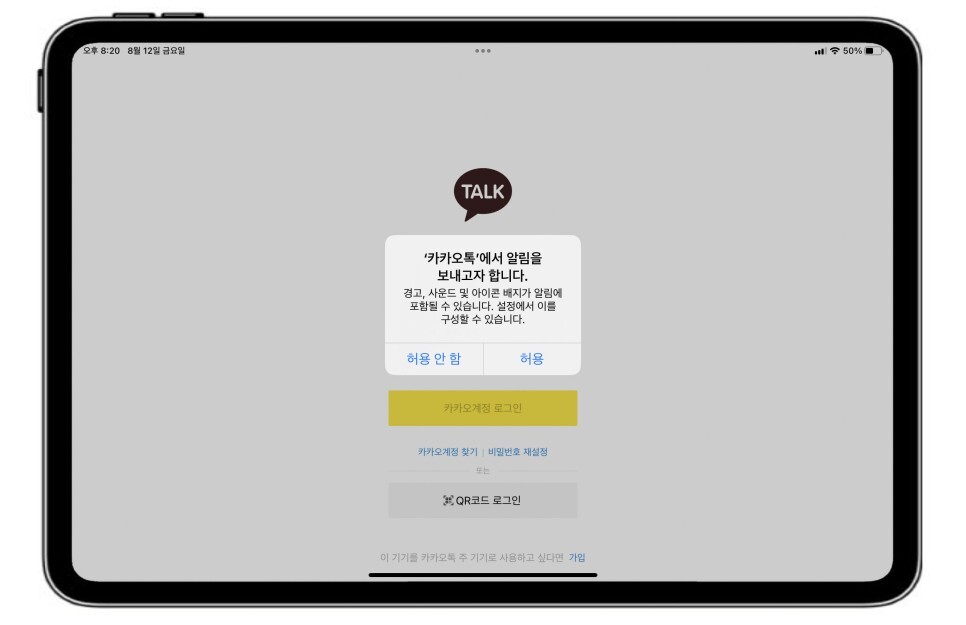 카카오톡을 아이패드, 맥북, 아이폰에서 같은 아이디를 이용해서 사용하고 있습니다. 이번에 간단한 출장이 많아지면서 가벼운 아이패드 미니 6세대에 카카오톡을 설치하였습니다.