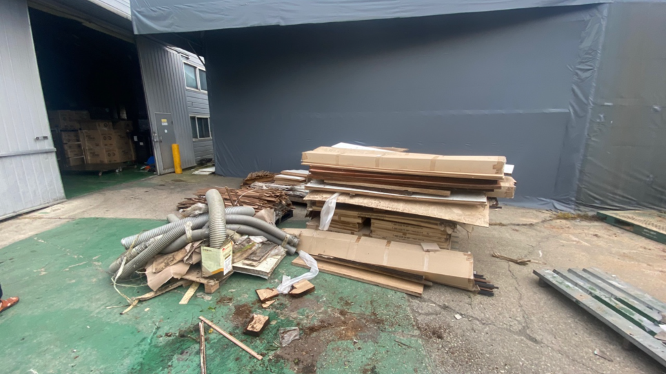 톱밥이 들어있는 마대 자루를 정리하면서 주변을 둘러보니 공장이다 보니 여러 작업을 하시는 것 같은데 폐기물 때문에 이동하는 데 불편해 보이는 모습도 보입니다.