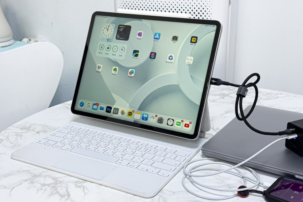 맥북프로와 아이패드 프로를 함께 사용하면서 충전이 가능하다는 것이 장점입니다. 100W 출력에 4포트로 노트북, 태블릿, 스마트폰, 무선 이어폰 등 여러 기기를 동시에 고속으로 충전 가능해서 추가적으로 아이폰 같은 스마트폰을 함께 충전할 수 있다는 것이 장점입니다.