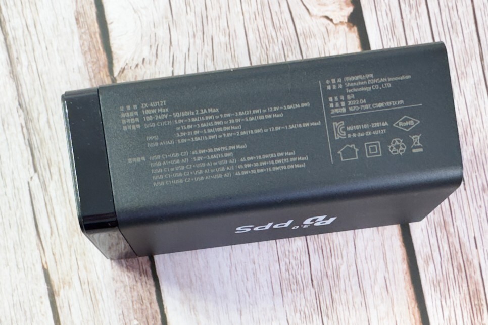모델명은 ZX-4012T이고 최대 출력 100W Max로 제품명에 "고링크100W GaN멀티고속충전기"라고 하는데 최대 값을 표시 한 것입니다. 정격 출력으로는 100-240V - 50/60Hz 2.5A Max가 최고치입니다.