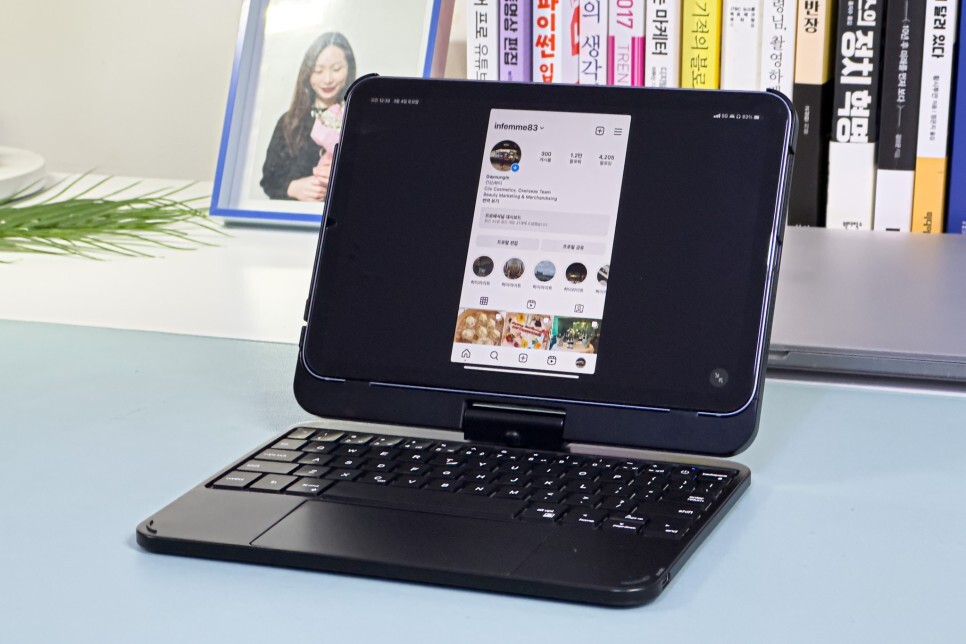 완전히 접어서 일체형으로 사용이 가능한데 저는 클라이언트 인스타그램 모니터링 할 때 사용하고 있습니다. 무게가 늘어난다는 것을 제외하면 정말 편의성이 좋습니다. 들고다닐 때는 폴리오 케이스를 사용하면 되니 큰 문제도 없습니다.