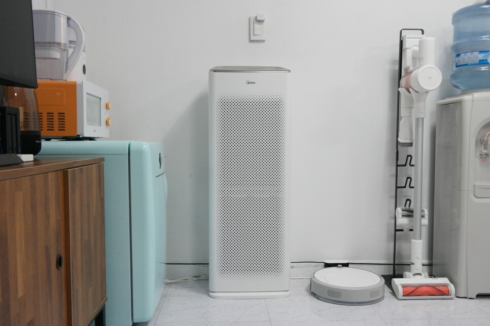 큰 사이즈 이지만, 높이가 높아서 위로 올라가면서 청정된 공기를 넓은 공간에 뿌려주고 있습니다. 수직으로 토출하여 공기청정기를 벽에 붙여도 성능이 떨이지지 않는 것 같습니다.