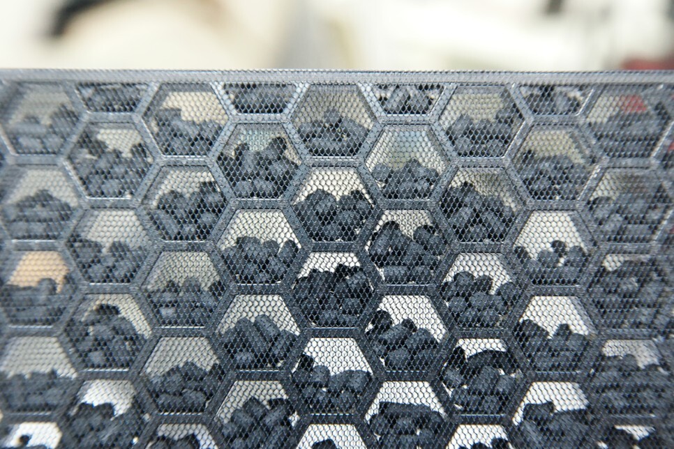 마이크로 에어케어 시스템 공기청정기로 프리필터/ 탈취필터/ 마이크로 집진필터 이렇게 3가지 필터로 구성되어 있는데, 제일 인상적인 것이 탈취 필더에 활성탄이 고스란히 보이는 것입니다.